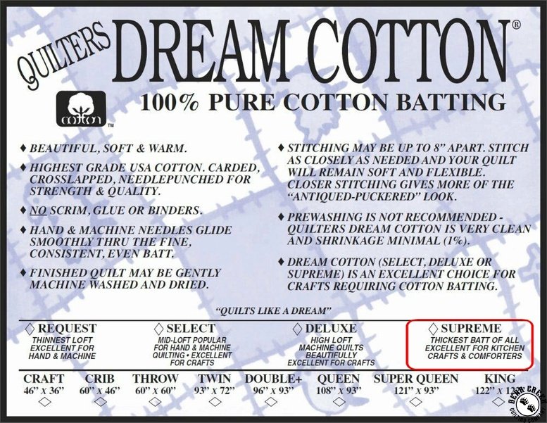Cotton - Supreme Loft: Quilters Dream Batting uses the finest cotton available; no scrim, glue or binders. Quilters Dream Batting proudly bears Cotton Incorporated's Black Seal. Exceptional soft drape, dreamy to quilt, imparts a beautiful look and feel to your quilt. Long staple cotton fibers combined with their special needle punch process prevents shifting and bunching. Stitch up to 8" apart. No prewashing required. May be machine washed and dried.