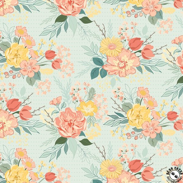 Mr. and Mrs. Birdie are donning their finest spring attire and are ready to celebrate the season.  Are you?  The New Beginnings  designer fabric collection by Sandy Gervais features a bounty of gorgeous florals and geometric prints.  Your sewing machine will be chirping along with you as you create the beautiful springtime quilts that coordinate with this delightful collection.