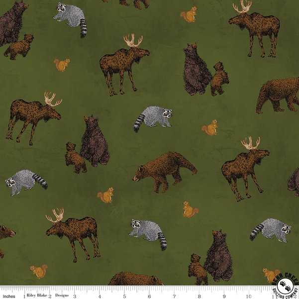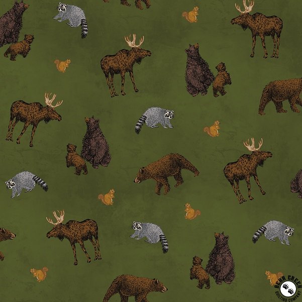Happy campers abound with Pine Grove  from the RBD Designers!  The main print is filled with postcard moments of wildlife, canoes, cabins, tents, glampers and other camper themed things.  The coordinating prints of wildlife, trees, pinecones, plaids and more will have you hankering for the great outdoors.  The woodsy palette of brown, putty, black, green and tan will naturally have you creating all kinds of projects for at home and on the road.  Don't miss the stunning "pen & ink" Pine Grove Outlines wideback.  The Great Outdoors are calling and we want s'more!