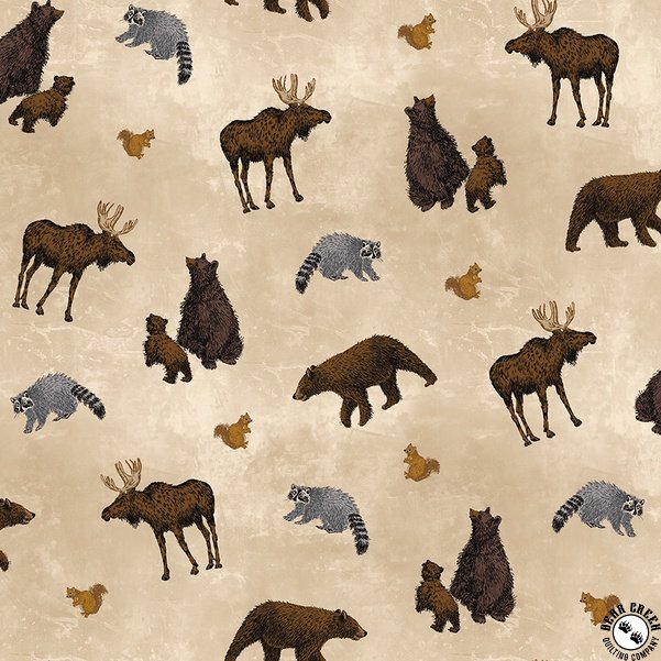 Happy campers abound with Pine Grove from the RBD Designers! The main print is filled with postcard moments of wildlife, canoes, cabins, tents, glampers and other camper themed things. The coordinating prints of wildlife, trees, pinecones, plaids and more will have you hankering for the great outdoors. The woodsy palette of brown, putty, black, green and tan will naturally have you creating all kinds of projects for at home and on the road. Don't miss the stunning "pen & ink" Pine Grove Outlines wideback. The Great Outdoors are calling and we want s'more!