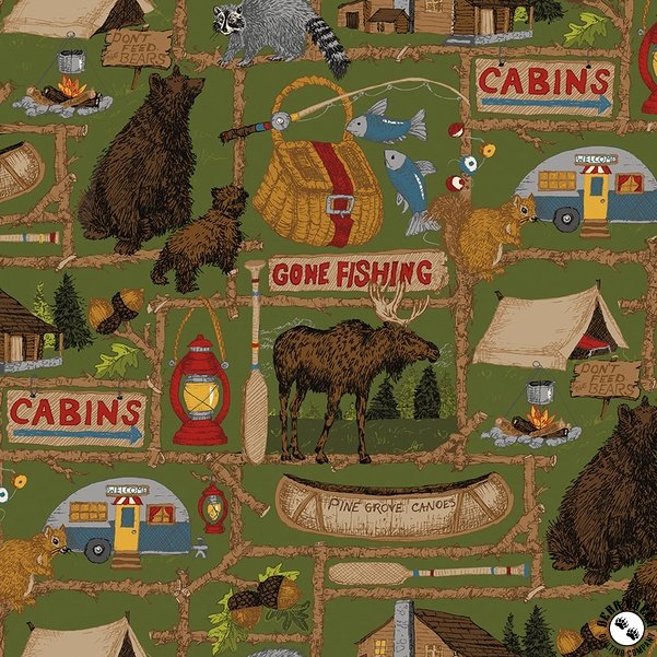 Happy campers abound with Pine Grove  from the RBD Designers!  The main print is filled with postcard moments of wildlife, canoes, cabins, tents, glampers and other camper themed things.  The coordinating prints of wildlife, trees, pinecones, plaids and more will have you hankering for the great outdoors.  The woodsy palette of brown, putty, black, green and tan will naturally have you creating all kinds of projects for at home and on the road.  Don't miss the stunning "pen & ink" Pine Grove Outlines wideback.  The Great Outdoors are calling and we want s'more!