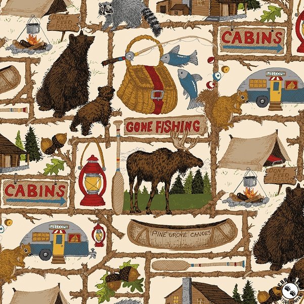 Happy campers abound with Pine Grove  from the RBD Designers!  The main print is filled with postcard moments of wildlife, canoes, cabins, tents, glampers and other camper themed things.  The coordinating prints of wildlife, trees, pinecones, plaids and more will have you hankering for the great outdoors.  The woodsy palette of brown, putty, black, green and tan will naturally have you creating all kinds of projects for at home and on the road.  Don't miss the stunning "pen & ink" Pine Grove Outlines wideback.  The Great Outdoors are calling and we want s'more!