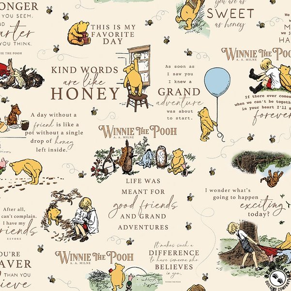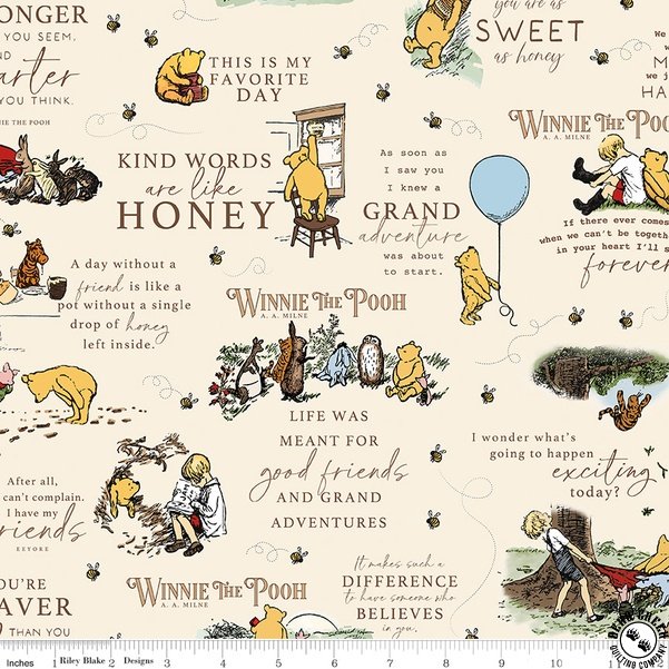 The Winnie The Pooh  fabric collection captures the heartwarming nostalgia of childhood through delightful designs inspired by dear friends and grand adventures.  Featuring a gentle palette of green, cream, blue, brown, and sunshine yellow, this collection highlights beloved characters, playful bees, classic plaids, and a whimsical map of the Hundred Acre Wood.  Perfect for cozy quilts and heartfelt crafts, this “silly old bear” fabric collection brings the timeless tales of friendship, wonder, and imagination beautifully to life.