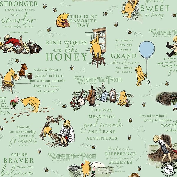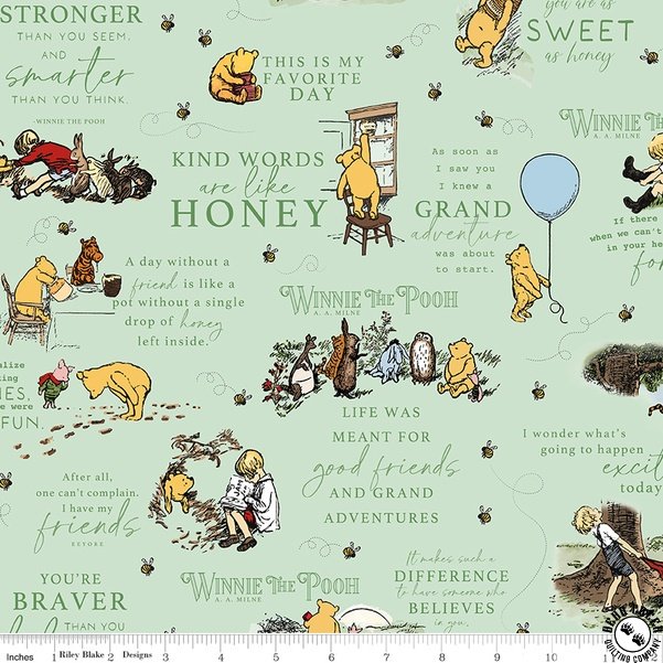 The Winnie The Pooh  fabric collection captures the heartwarming nostalgia of childhood through delightful designs inspired by dear friends and grand adventures.  Featuring a gentle palette of green, cream, blue, brown, and sunshine yellow, this collection highlights beloved characters, playful bees, classic plaids, and a whimsical map of the Hundred Acre Wood.  Perfect for cozy quilts and heartfelt crafts, this “silly old bear” fabric collection brings the timeless tales of friendship, wonder, and imagination beautifully to life.