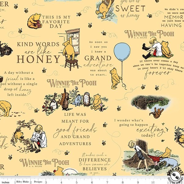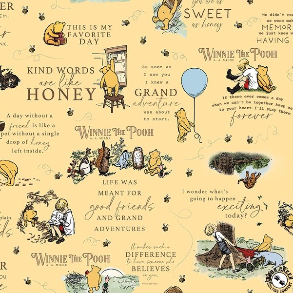 The Winnie The Pooh  fabric collection captures the heartwarming nostalgia of childhood through delightful designs inspired by dear friends and grand adventures.  Featuring a gentle palette of green, cream, blue, brown, and sunshine yellow, this collection highlights beloved characters, playful bees, classic plaids, and a whimsical map of the Hundred Acre Wood.  Perfect for cozy quilts and heartfelt crafts, this “silly old bear” fabric collection brings the timeless tales of friendship, wonder, and imagination beautifully to life.