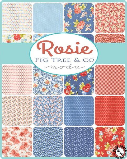 fabric collection is a heartfelt celebration of summertime in the country—homemade strawberry pie, lakeside picnics, small-town parades, and lazy afternoons spent on the porch.  Beyond its charming nostalgia, Rosie honors the fortitude, creativity, and courage of the women who came before us.  Inspired by the iconic Rosie the Riveter, a symbol of women who rolled up their sleeves and did what needed to be done, this collection is meant to inspire strength, ingenuity, and heartfelt creativity.  With a color palette drawn from Denim Jeans, Cherry Pie, and Whipped Cream, Rosie is a Fig Tree interpretation of a classic small-town summer.  We hope you’ll join us there as you dream up new quilts and projects for the ones you love.