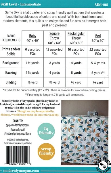 Same Sky Quilt Pattern View Larger Image Price: $12.99 1 item(s) available. Item # PTN-MM018 Tweet Pin It Same Sky Quilt PatternFeaturing the Sandalwood fabric collection by Moda. Pattern and instructions; fabric not included Finished quilt measures: Baby = 40 inches by 40 inches Square Throw = 60 inches by 60 inches Rectangular Throw = 60 inches by 80 inches Bed = 80 inches by 80 inches Designed by Morgan McCullough Produced by Modernly Morgan Copyright 2025 Related Products Moda Sandalwood Adeline Eucalyptus Item # 44383-13 $11.99 Moda Sandalwood Adeline Moonbeam Item # 44383-12 $11.99 Moda Sandalwood Adeline Rose Quartz Item # 44383-15 $11.99 Moda Sandalwood Camellia Eucalyptus Item # 44381-13 $11.99 Moda Sandalwood Camellia Indigo Item # 44381-14 $11.99 Moda Sandalwood Camellia Opal Item # 44381-11 $11.99 Moda Sandalwood Cassandra Moonbeam Item # 44384-12 $11.99 Moda Sandalwood Cassandra Opal Item # 44384-11 $11.99 Moda Sandalwood Cassandra Rosewood Item # 44384-17 $11.99 Moda Sandalwood Felicity Opal Item # 44388-11 $11.99 Moda Sandalwood Fleur Moonbeam Item # 44382-12 $11.99 Moda Sandalwood Fleur Opal Item # 44382-11 $11.99 Moda Sandalwood Harmony Moonbeam Item # 44387-12 $11.99 Moda Sandalwood Harmony Rose Quartz Item # 44387-15 $11.99 Moda Sandalwood Liana Opal Item # 44386-11 $11.99 Moda Sandalwood Rosalie Indigo Item # 44385-14 $11.99 Moda Sandalwood Rosalie Moonbeam Item # 44385-12 $11.99 Moda Sandalwood Rosalie Opal Item # 44385-11 $11.99 Moda Sandalwood Rosalie Rosewood Item # 44385-17 $11.99 Phoebe Quilt Pattern Item # PTN-SS419 $13.99 Sandalwood Fat Quarter Bundle by Moda Item # 44380AB $159.99 Sandalwood Jelly Roll by Moda Item # 44380JR $44.99