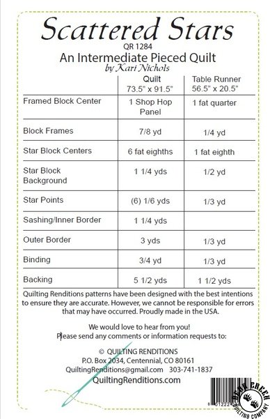 Scattered Stars Quilt Pattern View Larger Image Price: SALE $7.00 3 item(s) available. Item # PTN-SCATTERED-STARS | Reg. $10.00 Tweet Pin It Scattered Stars Quilt Pattern Featuring the 2025 All Oregon Shop Hop fabric collection by In The Beginning Fabrics. Pattern and instructions; fabric not included Finished quilt measures 73 1/2 inches by 91 1/2 inches Bonus Table Runner pattern included - 56 1/2 inches x 20 1/2 inches Designed by Kari Nichols Published by Quilting Renditions Copyright 2025 Related Products 2025 All Oregon Shop Hop Limited Edition Thread Collection by Aurifil Item # AURI-TM7SS010 | Reg. $39.99 SALE from $27.99 2025 All Pacific Northwest (Oregon & Washington) Shop Hop Magazine Item # MAG-2025-SHOP-HOP | Reg. $12.95 SALE from $6.00