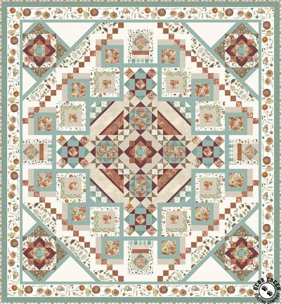 Season’s Study fabric collection with motifs from nature in earth and autumn colors. It’s a generous sized quilt with large nine-patch blocks in a straight set layout.