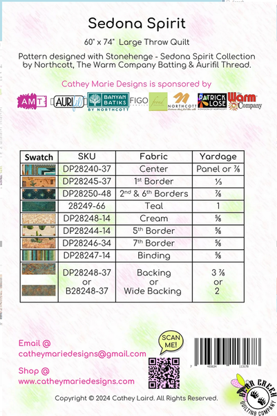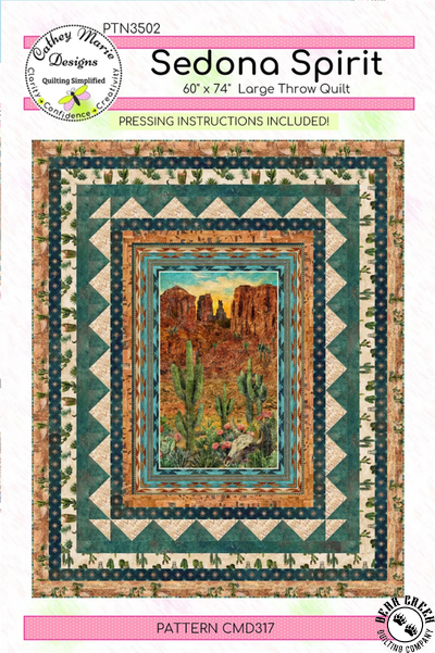 Sedona Spirit Quilt Pattern View Larger Image Price: SALE $3.00 1 item(s) available. Item # PTN-3502 | Reg. $11.99 Pin It Sedona Spirit Quilt PatternFeaturing the Stonehenge Sedona Spirit fabric collection by Northcott. Pattern and instructions; fabric not included Finished size is 60 inches by 74 inches Authored by Cathy Laird Published by Cathey Marie Designs Copyright 2025