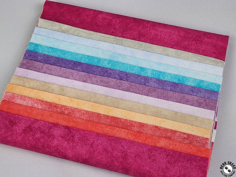 The ultimate fabric palette is here!  Shadow Play,  the supreme blender collection from Maywood Studio, now includes even more colors that will match anything and everything.  On-trend shades bring this basics collection up to a total of 168 distinct colors that will help your latest project pop.  Use them together to create shadows and highlights in pictorial quilts or in combination with any print or solid to make a cohesive quilt design.
