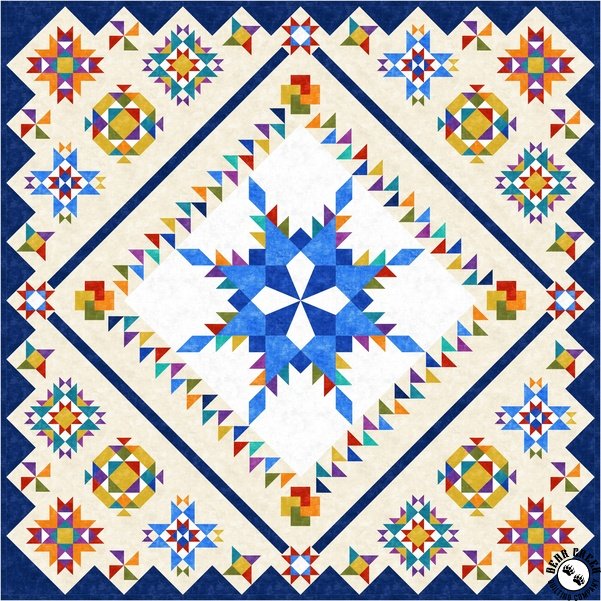 Quilt size varies. Quilt size will range from 106" x 106" to 108" x 108". How is this possible? The triangles in the triangle border are oversized. This helps with "oops" inthe piecing. After the quilt top is made, you will trim the excess off at the triangle border, no triangle top shall be cut off, no 1/4" seam allowance will be gone.