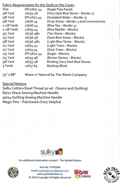 Soaring with the Eagles Quilt Pattern View Larger Image Price: $14.99 1 item(s) available. Item # PTN-3398 Tweet Pin It Soaring with the Eagles Quilt PatternFeaturing the Stonehenge Eagle Pass fabric collection by Northcott. Pattern and instructions; fabric not included Finished size is 68 inches by 82 inches Designed by Larene Smith Published by The Quilted Button Copyright 2025 Related Products Northcott Stonehenge Eagle Pass Eagle Scenic Blue/Multi Item # DP27672-44 $12.99 Northcott Stonehenge Eagle Pass Eagles Light Blue/Multi Item # 27675-42 $11.99 Northcott Stonehenge Eagle Pass Mixer Blue/Multi Item # 27679-44 $11.99 Northcott Stonehenge Eagle Pass Open Tress Light Blue/Multi Item # 27674-42 $11.99 Northcott Stonehenge Eagle Pass Packed Trees Blue/Multi Item # 27673-44 $11.99 Northcott Stonehenge Eagle Pass Panel Item # DP27670-44 $9.99 Northcott Stonehenge Eagle Pass Rock Face Taupe Item # 27676-34 $11.99 Northcott Stonehenge Eagle Pass Water Turquoise Item # 27677-64 $11.99 Soar Quilt Pattern Item # PTN-3397 $14.99