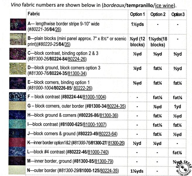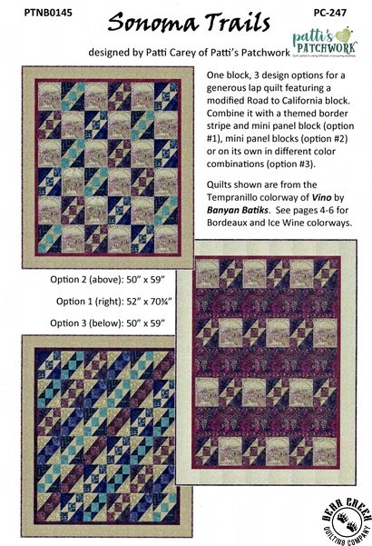 Sonoma Trails Quilt Pattern View Larger Image Price: SALE $8.39 8 item(s) available. Item # PTNB-0145 | Reg. $11.99 Pin It Sonoma Trails Quilt PatternFeaturing the Vino Batiks fabric collection by Northcott. Pattern and instructions; fabric not included Finished quilt sizes included: Option #1: 52 inches by 70 3/4 inches Option #2: 50 inches by 59 inches Option #3: 50 inches by 59 inches Designed and published by Patti Carey of Patti's Patchwork Copyright 2019
