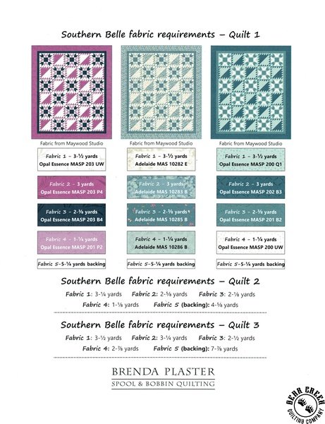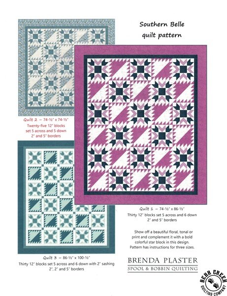Southern Belle Quilt Pattern View Larger Image Price: SALE $3.75 11 item(s) available. Item # PTN-SBQ132 | Reg. $14.99 Pin It Southern Belle Quilt PatternFeaturing the Adelaide fabric collection by Maywood Studio. Pattern and instructions; fabric not included Finished quilt measures 74 1/2 inches by 86 1/2 inches Designed by Brenda Plaster Produced by Spool and Bobbin Quilting Copyright 2023