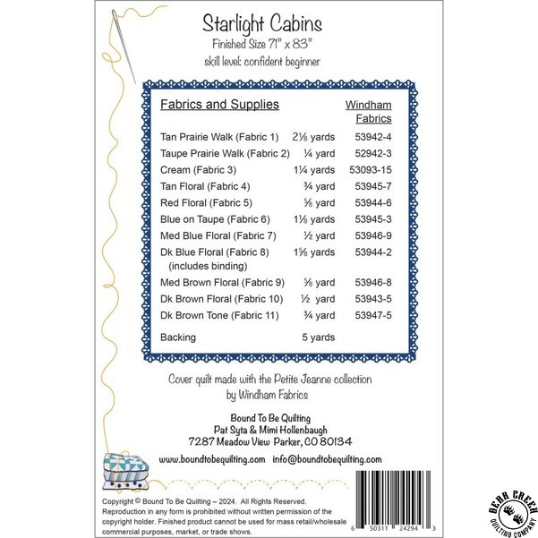 Starlight Cabins Quilt Pattern View Larger Image Price: SALE $8.39 13 item(s) available. Item # PTN-BTBQ431 | Reg. $11.99 Tweet Pin It Starlight Cabins Quilt PatternFeaturing the Petite Jeanne fabric collection by Windham Fabrics. Pattern and instructions; fabric not included Finished quilt measures 71 inches by 83 inches Designed by Pat Syta and Mimi Hollenbaugh Produced by Bound To Be Quilting Copyright 2024 Related Products Belle Blooms Quilt Pattern Item # PTN-BTBQ229 | Reg. $24.99 SALE from $17.49 Intertwined Stars Quilt Pattern Item # PTN-BTBQ432 | Reg. $11.99 SALE from $8.39 Petite Jeanne Fouldard a Fleurs Free Quilt Pattern Item # petite-jeanne-fouldard-a-fleurs-free-quilt-pattern $0.00
