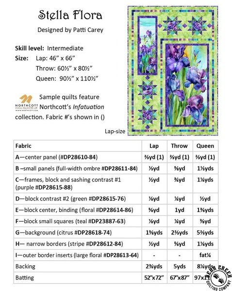 Stella Flora Quilt Pattern View Larger Image Price: $12.99 6 item(s) available. Item # PTN-3557 Tweet Pin It Stella Flora Quilt PatternFeaturing the Infatuation fabric collection by Northcott. Pattern and instructions; fabric not included Finished size is: Lap = 46 inches by 66 inches Throw = 60 1/2 inches by 80 1/2 inches Queen = 90 1/2 inches by 110 1/2 inches Designed by Patti Carey Published by Patti's Patchwork Copyright 2025 Related Products Northcott Infatuation 108 Inch Wide Backing Fabric White/Multi Item # B28616-10 $21.99 Northcott Infatuation Iris Feature Green/Multi Item # DP28613-74 $13.99 Northcott Infatuation Multi Texture White/Multi Item # DP28616-10 $13.99 Northcott Infatuation Packed Iris Dark Purple/Multi Item # DP28614-86 $13.99 Northcott Infatuation Packed Iris White/Multi Item # DP28614-10 $13.99