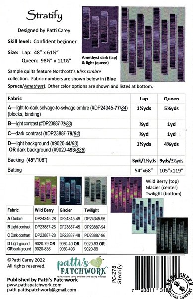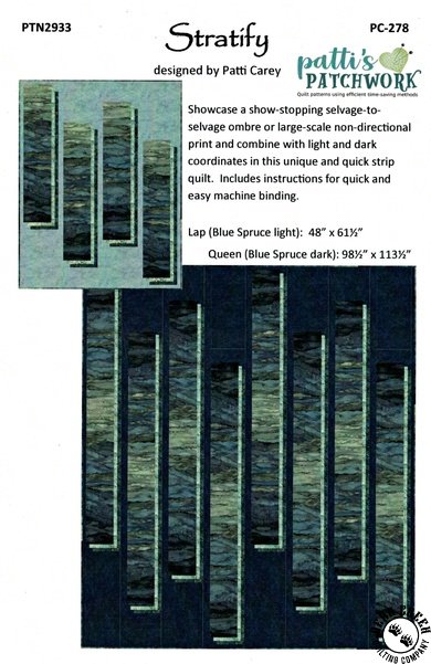 Stratify Quilt Pattern View Larger Image Price: SALE $8.39 7 item(s) available. Item # PTN-2933 | Reg. $11.99 Tweet Pin It Stratify Quilt PatternFeaturing the Bliss Ombre Ensemble fabric collection by Northcott. Pattern and instructions; fabric not included Finished quilt measures 48 inches by 61 1/2 inches Designed by Patti Carey Published by Patti's Patchwork Copyright 2022 Related Products Ombre Bliss Quilt Pattern Item # PTN-2935 | Reg. $11.99 SALE from $8.39