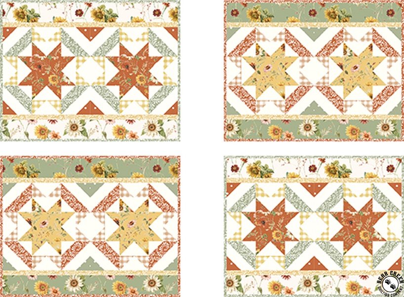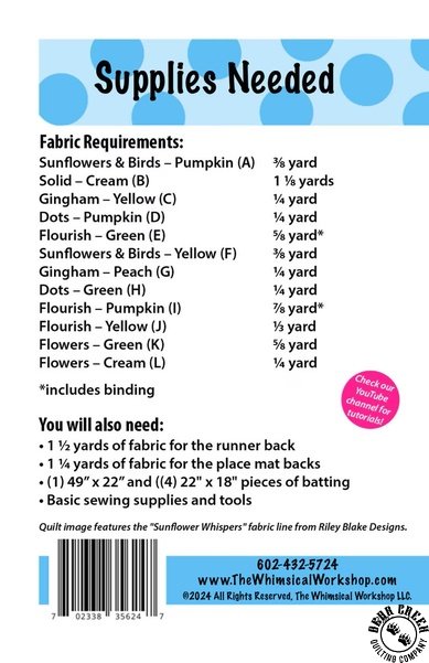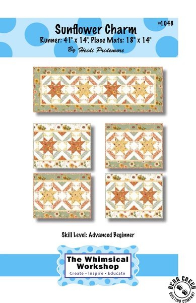 Sunflower Charm Runner and Place Mats Pattern View Larger Image Price: SALE $3.25 7 item(s) available. Item # PTN-1048 | Reg. $12.99 Pin It Sunflower Charm Runner and Place Mats PatternFeaturing the Sunflower Whispers fabric collection by Riley Blake Designs. Pattern and instructions; fabric not included Finished size is: Runner = 41 inches by 14 inches Place Mats = 18 inches by 14 inches Designed by Heidi Pridemore Published by The Whimsical Workshop Copyright 2025 Related Products Fall Garden Quilt Pattern Item # PTN-SNQ048 | Reg. $11.99 SALE from $3.00 Riley Blake Designs Sunflower Whispers Ferns Blush Item # C16672-BLUSH | Reg. $11.99 SALE from $7.19 Riley Blake Designs Sunflower Whispers Ferns Pumpkin Item # C16672-PUMPKIN | Reg. $11.99 SALE from $7.19 Riley Blake Designs Sunflower Whispers Gingham Blush Item # C16674-BLUSH | Reg. $11.99 SALE from $7.19 Sunflower Whispers Fat Quarter Bundle by Riley Blake Designs Item # FQ-16670-19 | Reg. $59.99 SALE from $35.99 Sunflower Whispers Free Quilt Pattern Item # sunflower-whispers-free-quilt-pattern $0.00