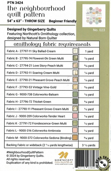 The Neighborhood Quilt Pattern View Larger Image Price: SALE $3.75 6 item(s) available. Item # PTN-3424 | Reg. $14.99 Pin It The Neighborhood Quilt PatternFeaturing the Ornithology fabric collection by Northcott. Pattern and instructions; fabric not included Finished size is 54 inches by 63 inches Authored by Jody Groenendyk Published by Gingerberry Quilts Copyright 2024