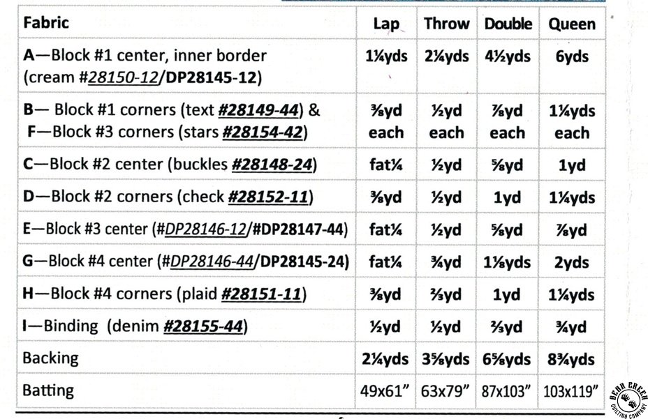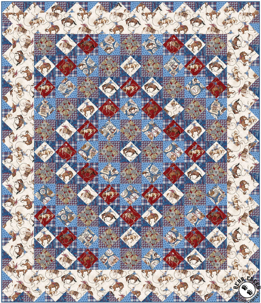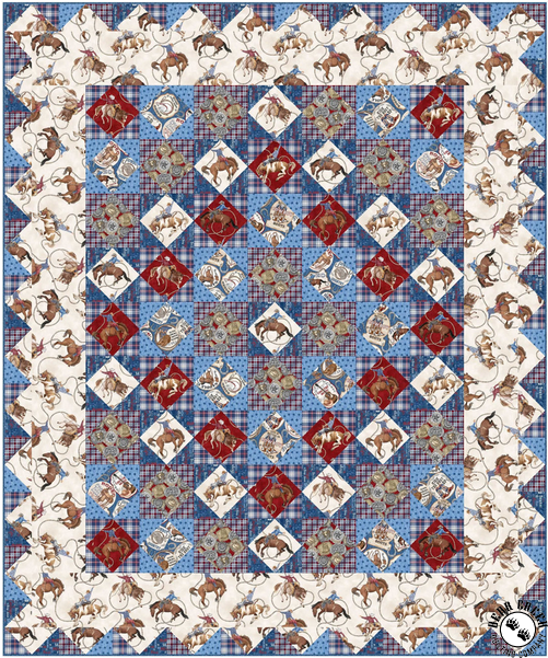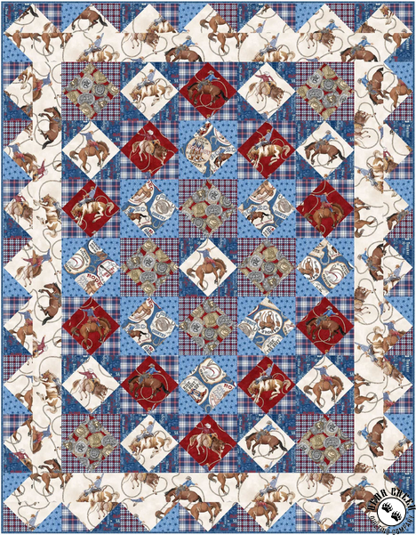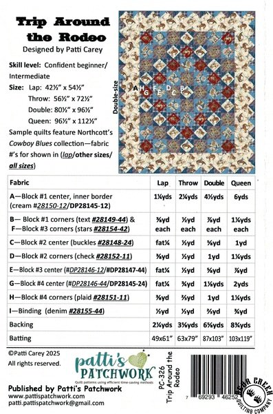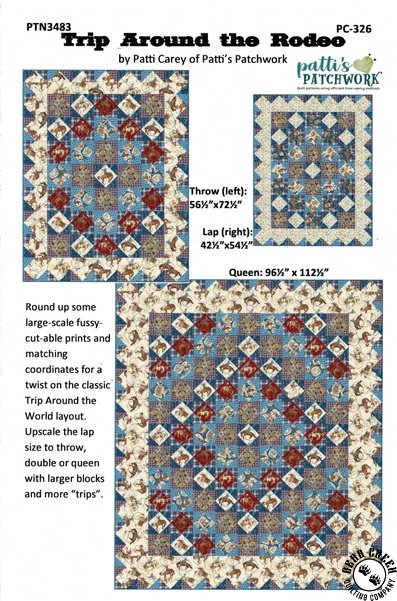 Trip Around the Rodeo Quilt Pattern View Larger Image Price: SALE $9.59 1 item(s) available. Item # PTN-3483 | Reg. $11.99 Tweet Pin It Trip Around the Rodeo Quilt PatternFeaturing the Cowboy Blues fabric collection by Northcott. Pattern and instructions; fabric not included Finished size measures: Lap = 42 1/2 inches by 54 1/2 inches Throw = 56 1/2 inches by 72 1/2 inches Double = 80 1/2 inches by 96 1/2 inches Queen = 96 1/2 inches by 112 1/2 inches Designed by Patti Carey Published by Patti's Patchwork Copyright 2025 Related Products Cowboy Stars Quilt Pattern Item # PTN-3485 | Reg. $11.99 SALE from $9.59 Northcott Cowboy Blues Boots Blue/Multi Item # DP28146-44 | Reg. $12.99 SALE from $10.39 Northcott Cowboy Blues Boots Cream/Multi Item # DP28146-12 | Reg. $12.99 SALE from $10.39 Northcott Cowboy Blues Buckles Red/Multi Item # 28148-24 | Reg. $11.99 SALE from $9.59 Northcott Cowboy Blues Large Check Cream/Multi Item # 28151-11 | Reg. $11.99 SALE from $9.59 Northcott Cowboy Blues Sayings Blue/Multi Item # DP28147-44 | Reg. $12.99 SALE from $10.39 Northcott Cowboy Blues Small Check Cream/Multi Item # 28152-11 | Reg. $11.99 SALE from $9.59 Northcott Cowboy Blues Words Blue/Multi Item # 28149-44 | Reg. $11.99 SALE from $9.59