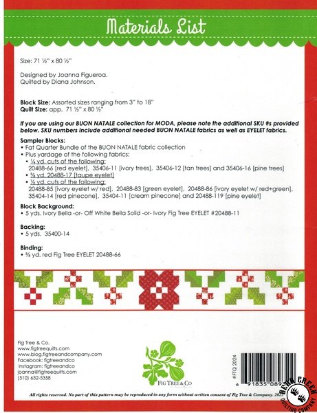 Twas The Night Before Christmas Quilt Pattern View Larger Image Price: SALE $11.25 5 item(s) available. Item # PTN-FTQ2024 | Reg. $44.99 Pin It Twas the Night Before Christmas Quilt PatternFeaturing the Buon Natale fabric collection by Moda. Pattern and instructions; fabric not included Finished size is 71 1/2 inches by 80 1/2 inches Designed by Joanna Figueroa Published by Fig Tree and Co. Copyright 2025