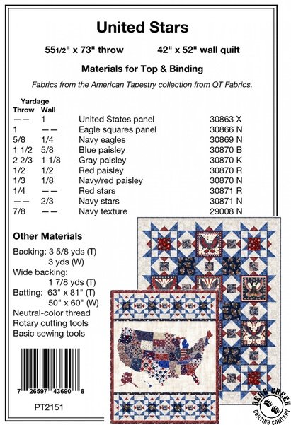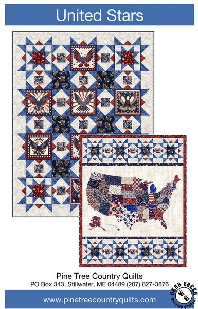 United Stars Quilt Pattern View Larger Image Price: SALE $8.39 1 item(s) available. Item # PTN-PT2151 | Reg. $11.99 Tweet Pin It United Stars Quilt PatternFeaturing the American Tapestry fabric collection by QT Fabrics. Pattern and instructions; fabric not included Finished quilt measures: Wall = 42 inches by 52 inches Throw = 55 1/2 inches by 73 inches Designed by Sue Harvey and Sandy Boobar Published by Pine Tree Country Quilts Copyright 2025 Related Products Liberty Patches Quilt Pattern Item # PTN-BTBQ492 | Reg. $11.99 SALE from $8.39