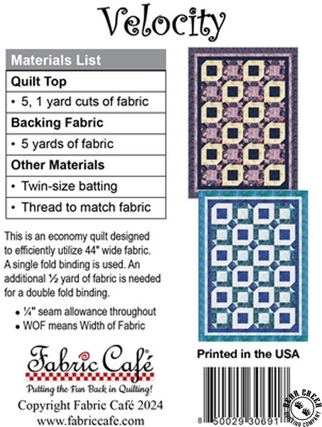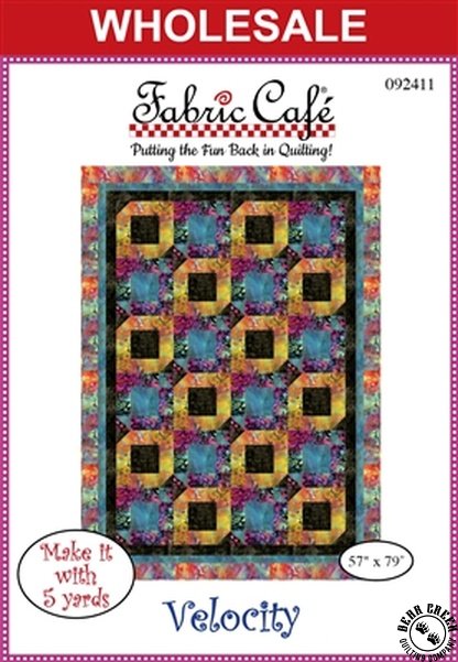Velocity Quilt Pattern With the Velocity 5-Yard Quilt Pattern, you simply take 5, one-yard cuts of fabric plus a few hours and make a beautiful quilt top with binding and borders. The pattern includes an assembly diagram and step-by-step directions that make your cutting and piecing a breeze!