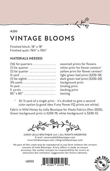 Vintage Blooms Quilt Pattern View Larger Image Price: $11.99 8 item(s) available. Item # PTN-250 Pin It Vintage Blooms Quilt PatternFeaturing the Wild Honey fabric collection by Moda. Pattern and instructions; fabric not included Finished size is 76 1/2 inches by 76 1/2 inches Designed by Vanessa Goertzen Published by Lella Boutique Copyright 2025 Related Products Bloom and Buzz Quilt Pattern Item # PTN-247 $11.99 Dreamer Quilt Pattern Item # PTN-246 $11.99 Mini Charmed Quilt Pattern Item # PTN-249 $11.99 Moda Wild Honey Bumbling Posies Carnation Item # 5252-12 $12.99 Moda Wild Honey Bumbling Posies Daisy Item # 5252-11 $12.99 Moda Wild Honey Bumbling Posies Fern Item # 5252-15 $12.99 Moda Wild Honey Bumbling Posies Honey Item # 5252-16 $12.99 Moda Wild Honey Bumbling Posies Rose Water Item # 5252-13 $12.99 Moda Wild Honey Bumbling Posies sky Item # 5252-14 $12.99 Moda Wild Honey Buzz Words Daisy Item # 5254-11 $12.99 Moda Wild Honey Buzz Words Fern Item # 5254-15 $12.99 Moda Wild Honey Buzz Words Honey Item # 5254-16 $12.99 Moda Wild Honey Buzz Words Rose Water Item # 5254-13 $12.99 Moda Wild Honey Buzz Words Sky Item # 5254-14 $12.99 Moda Wild Honey Honeycomb Carnation Item # 5253-12 $12.99 Moda Wild Honey Honeycomb Daisy/White Item # 5253-21 $12.99 Moda Wild Honey Honeycomb Fern Item # 5253-15 $12.99 Moda Wild Honey Honeycomb Honey Item # 5253-16 $12.99 Moda Wild Honey Honeycomb Sky Item # 5253-14 $12.99 Moda Wild Honey Magic Dot Breeze Item # 5230-54 $12.99 Moda Wild Honey Magic Dot Carnation Item # 5230-52 $12.99 Moda Wild Honey Magic Dot Fern Item # 5230-19 $12.99 Moda Wild Honey Magic Dot Honey Item # 5230-56 $12.99 Moda Wild Honey Magic Dot Rose Water Item # 5230-53 $12.99 Moda Wild Honey Monofloral Fern Item # 5251-15 $12.99 Moda Wild Honey Monofloral Honey Item # 5251-16 $12.99 Moda Wild Honey Monofloral Rose Water Item # 5251-13 $12.99 Moda Wild Honey Monofloral Sky Item # 5251-14 $12.99 Moda Wild Honey Wildflower Dance Carnation Item # 5250-12 $12.99 Moda Wild Honey Wildflower Dance Daisy Item # 5250-11 $12.99 Moda Wild Honey Wildflower Dance Honey Item # 5250-16 $12.99 Moda Wild Honey Wildflower Dance Sky Item # 5250-14 $12.99 Wild Honey Charm Pack by Moda Item # 5250PP $12.99 Wild Honey Fat Quarter Bundle by Moda Item # 5250AB $149.99 Wild Honey Jelly Roll by Moda Item # 5250JR $49.99 Wild Honey Layer Cake by Moda Item # 5250LC $49.99