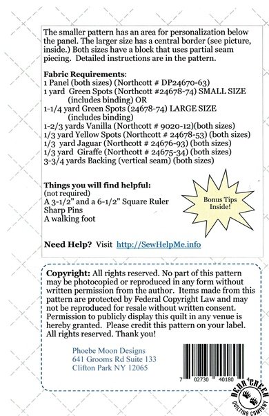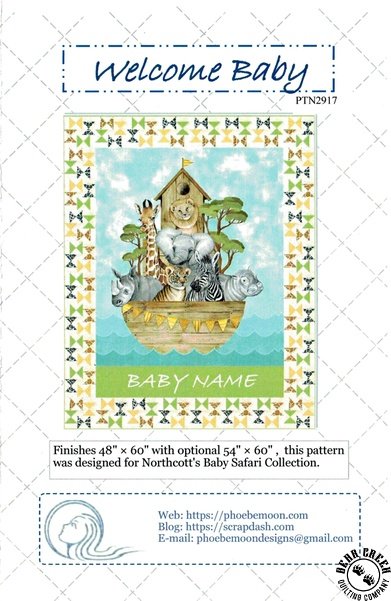 Welcome Baby Quilt Pattern View Larger Image Price: SALE $8.39 4 item(s) available. Item # PTN-2917 | Reg. $11.99 Tweet Pin It Welcome Baby Quilt PatternFeaturing the Baby Safari fabric collection by Northcott. Pattern and instructions; fabric not included Finished quilt measures: 48 inches by 60 inches 54 inches by 60 inches Designed by Kris Driessen Published by Phoebe Moon Designs Copyright 2022