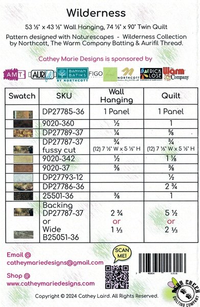 Wilderness Quilt Pattern View Larger Image Price: SALE $10.49 10 item(s) available. Item # PTN-3449 | Reg. $14.99 Tweet Pin It Wilderness Quilt PatternFeaturing the Wilderness Naturescapes fabric collection by Northcott. Pattern and instructions; fabric not included Finished quilt size: Wall Hanging = 53 1/2 inches by 43 1/2 inches Twin Quilt = 74 1/2 inches by 90 inches Designed by Cathey Laird Published by Cathey Marie Designs Copyright 2025 Related Products Northcott Naturescapes Wilderness Birch Bark Beige/Multi Item # DP27793-12 | Reg. $12.99 SALE from $9.09 Northcott Naturescapes Wilderness Birch Logs Beige/Multi Item # DP27792-12 | Reg. $12.99 SALE from $9.09 Northcott Naturescapes Wilderness Packed Leaves Rust/Multi Item # DP27789-37 | Reg. $12.99 SALE from $9.09 Northcott Naturescapes Wilderness Panel Item # DP27785-36 | Reg. $9.99 SALE from $6.99 Northcott Naturescapes Wilderness Tossed Animals Beige/Multi Item # DP27791-12 | Reg. $12.99 SALE from $9.09 Northcott Naturescapes Wilderness Trees Rust/Multi Item # DP27788-37 | Reg. $12.99 SALE from $9.09