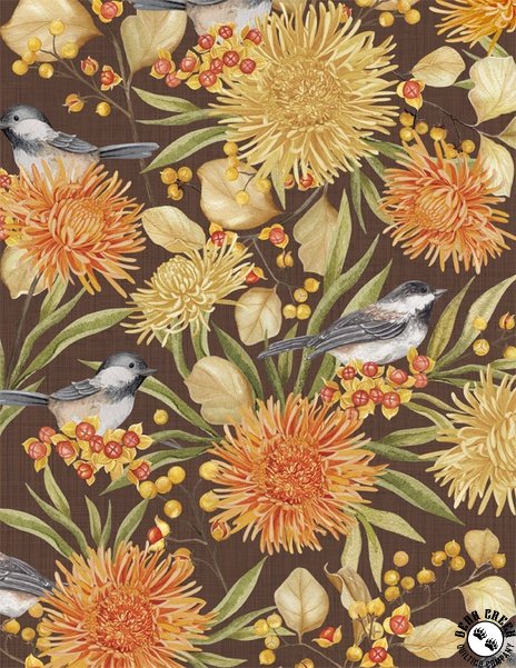 Chickadee Charm captures the essence of natural beauty with an earthy elegance. This warm, inviting collection features a stunning mix of florals, birds, and botanicals in rich tones of yellow, orange, brown, and green. Highlights include a large scenic panel and a coordinating repeating stripe, complemented by packed florals, graceful chickadees, scattered chrysanthemums, delicate berry tosses, and tonal petal prints — perfect for creating projects that celebrate the serenity of nature.