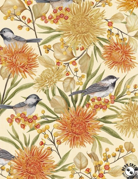 Chickadee Charm captures the essence of natural beauty with an earthy elegance. This warm, inviting collection features a stunning mix of florals, birds, and botanicals in rich tones of yellow, orange, brown, and green. Highlights include a large scenic panel and a coordinating repeating stripe, complemented by packed florals, graceful chickadees, scattered chrysanthemums, delicate berry tosses, and tonal petal prints — perfect for creating projects that celebrate the serenity of nature.
