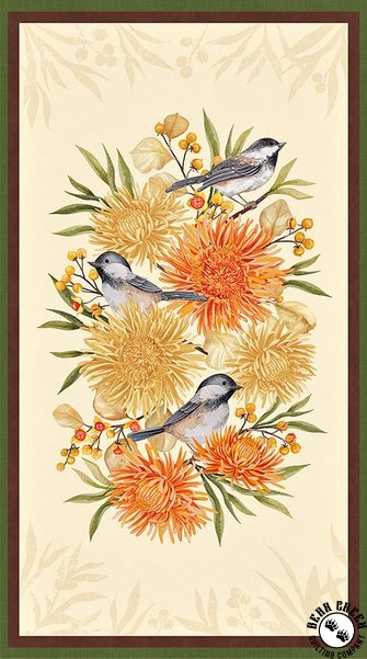 Chickadee Charm captures the essence of natural beauty with an earthy elegance. This warm, inviting collection features a stunning mix of florals, birds, and botanicals in rich tones of yellow, orange, brown, and green. Highlights include a large scenic panel and a coordinating repeating stripe, complemented by packed florals, graceful chickadees, scattered chrysanthemums, delicate berry tosses, and tonal petal prints — perfect for creating projects that celebrate the serenity of nature.