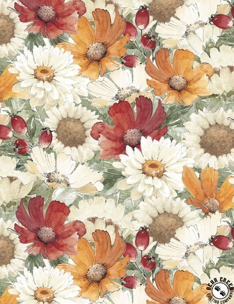 Harvest Blooms  is a charming fabric collection that captures the warmth and beauty of autumn. Featuring seven unique patterns—including a versatile repeating stripe, lush packed florals, playful dots, and harvest-inspired prints—this line offers endless creative possibilities. The palette glows with cozy creams, vibrant reds, rich sage greens, and bright oranges, all enhanced by delicate watercolor textures and nature-inspired motifs. Perfect for quilts, home decor, or seasonal projects, Harvest Blooms  brings the essence of fall to life in every stitch.