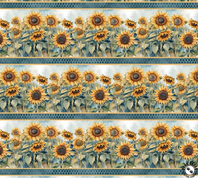 Sunkissed  radiates the warmth and charm of sunflowers in full bloom. This cheerful collection features a bold large panel and a versatile border stripe, paired with sunflower, bee, and honeycomb motifs that capture the beauty of nature. Soft watercolor textures, playful plaids, and a vibrant palette of blues, yellows, and greens bring a fresh, sunlit feel to every design. Perfect for quilts, home decor, and seasonal accents, Sunkissed  adds a touch of golden sunshine to any room.