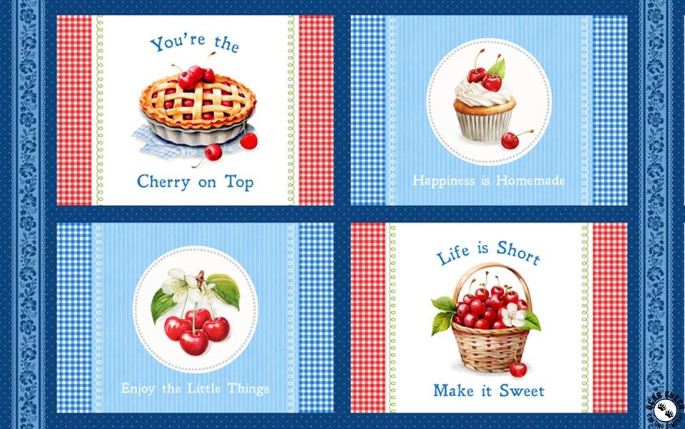 Sweet Cherry  fabric collection is cheerful and playful which features charming designs centered around cherries and sweet treats.  It includes an apron panel and a placemat block panel, along with a repeating stripe—perfect for adding a touch of whimsy to any kitchen decor or project!