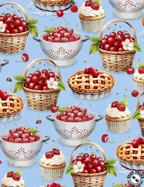 Sweet Cherry  fabric collection is cheerful and playful which features charming designs centered around cherries and sweet treats.  It includes an apron panel and a placemat block panel, along with a repeating stripe—perfect for adding a touch of whimsy to any kitchen decor or project!