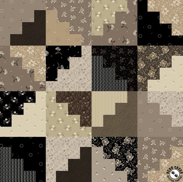 Circa: Onyx dances on the dark side with deep hues of walnut, ebony, espresso, and touches of taupe. Fit for the coverlet of a main character in a gothic tale, this collection brings a shade of sophistication and timeless appeal to traditional motifs. Make a new heirloom with a log cabin-inspired cheater cloth and additional collection prints.