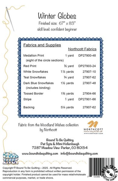 Winter Globes Quilt Pattern View Larger Image Price: SALE $11.19 11 item(s) available. Item # PTN-3437/BTBQ497 | Reg. $13.99 Tweet Pin It Winter Globes Quilt PatternFeaturing the Woodland Wishes fabric collection by Northcott. Pattern and instructions; fabric not included Finished size is 67 inches by 83 inches Designed by Pat Syta and Mimi Hollenbaugh Published by Bound To Be Quilting Copyright 2025 Related Products Northcott Woodland Wishes Bear Toss Medium Teal/Multi Item # 27905-64 | Reg. $12.99 SALE from $10.39 Northcott Woodland Wishes Bear Toss White/Multi Item # 27905-10 | Reg. $12.99 SALE from $10.39 Northcott Woodland Wishes Block Panel Item # DP27900-48 | Reg. $8.99 SALE from $7.19 Northcott Woodland Wishes Border Stripe Teal/Multi Item # DP27901-66 | Reg. $12.99 SALE from $10.39 Northcott Woodland Wishes Plain Stripe Red Item # 27906-24 | Reg. $12.99 SALE from $10.39 Northcott Woodland Wishes Small Circles Red/Multi Item # DP27903-24 | Reg. $12.99 SALE from $10.39 Northcott Woodland Wishes Snowflake Navy Item # 27907-48 | Reg. $12.99 SALE from $10.39 Northcott Woodland Wishes Snowflake Teal Item # 27907-62 | Reg. $12.99 SALE from $10.39 Northcott Woodland Wishes Snowflake White Item # 27907-10 | Reg. $12.99 SALE from $10.39 Northcott Woodland Wishes Words Teal/Multi Item # 27904-66 | Reg. $12.99 SALE from $10.39 Winter Bits and Bobs Quilt Pattern Item # PTN-3439 | Reg. $11.99 SALE from $9.59
