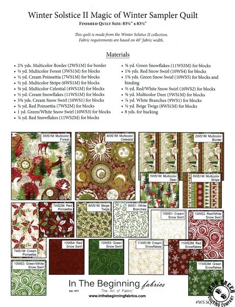 Winter Solstice II Sampler Quilt Pattern View Larger Image Price: SALE $9.59 4 item(s) available. Item # PTN-WSSQ-PATT | Reg. $11.99 Tweet Pin It Winter Solstice II Sampler Quilt PatternFeaturing the Winter Solstice II fabric collection by In The Beginning Fabrics. Pattern and instructions; fabric not included Finished size is 83 1/2 inches by 83 1/2 inches Designed by Jason Yenter Published by In The Beginning Fabrics Copyright 2025 Related Products In The Beginning Winter Solstice II Border Stripe Item # 2WS-1M | Reg. $12.99 SALE from $10.39 In The Beginning Winter Solstice II Branches White Item # 9WS-1 | Reg. $12.99 SALE from $10.39 In The Beginning Winter Solstice II Celestial Multi Item # 4WS-1M | Reg. $12.99 SALE from $10.39 In The Beginning Winter Solstice II Deer Multi Item # 5WS-1M | Reg. $12.99 SALE from $10.39 In The Beginning Winter Solstice II Panel Item # 1WS-1M | Reg. $12.99 SALE from $10.39 In The Beginning Winter Solstice II Poinsettia Cream Item # 7WS-1M | Reg. $12.99 SALE from $10.39 In The Beginning Winter Solstice II Poinsettia Dark Red Item # 7WS-2M | Reg. $12.99 SALE from $10.39 In The Beginning Winter Solstice II Stripe Multi Item # 6WS-1M | Reg. $12.99 SALE from $10.39 In The Beginning Winter Solstice II Twigs Beige Item # 8WS-1M | Reg. $12.99 SALE from $10.39 Winter Solstice II Panel Quilt Pattern Item # PTN-WSPQ-PATT | Reg. $7.99 SALE from $6.39