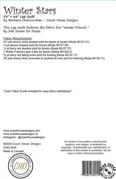 Winter Stars Quilt Pattern View Larger Image Price: SALE $8.39 6 item(s) available. Item # PTN-CHD-2435 | Reg. $11.99 Tweet Pin It Winter Stars Quilt PatternFeaturing the Winter Friends fabric collection by Moda. Pattern and instructions; fabric not included Finished size is 58 inches by 66 inches Designed by Barb Cherniwchan Published by Coach House Designs Copyright 2025 Related Products Moda Winter Friends 108 Inch Wide Backing Fabric Falling Snow Charcoal Black Item # BACKING-108030-18 | Reg. $21.99 SALE from $15.39 Moda Winter Friends Falling Snow Charcoal Black Item # 56134-18 | Reg. $12.49 SALE from $8.74 Moda Winter Friends Shaded Solid Spruce Item # 56127-26 | Reg. $12.49 SALE from $8.74 Moda Winter Friends Stacked Snowmen Berry Red Item # 56135-17 | Reg. $12.49 SALE from $8.74 Moda Winter Friends Stacked Snowmen Charcoal Black Item # 56135-18 | Reg. $12.49 SALE from $8.74 Moda Winter Friends Stacked Snowmen Fog Item # 56135-12 | Reg. $12.49 SALE from $8.74 Moda Winter Friends Tossed Trees Charcoal Black Item # 56136-18 | Reg. $12.49 SALE from $8.74 Moda Winter Friends Tossed Trees Snowy White Item # 56136-11 | Reg. $12.49 SALE from $8.74 Moda Winter Friends Winter Damask Berry Red Item # 56133-17 | Reg. $12.49 SALE from $8.74 Moda Winter Friends Winter Damask Snowy White Item # 56133-11 | Reg. $12.49 SALE from $8.74 Moda Winter Friends Winter Damask Spruce Item # 56133-16 | Reg. $12.49 SALE from $8.74 Moda Winter Friends Winter Plaid Berry Red Item # 56137-17 | Reg. $12.49 SALE from $8.74 Moda Winter Friends Winter Plaid Charcoal Black Item # 56137-18 | Reg. $12.49 SALE from $8.74 Moda Winter Friends Winter Plaid Spruce Item # 56137-16 | Reg. $12.49 SALE from $8.74 Winter Friends Fat Quarter Bundle by Moda Item # 56130AB | Reg. $139.99 SALE from $97.99 Winter Friends Jelly Roll by Moda Item # 56130JR | Reg. $44.99 SALE from $31.49