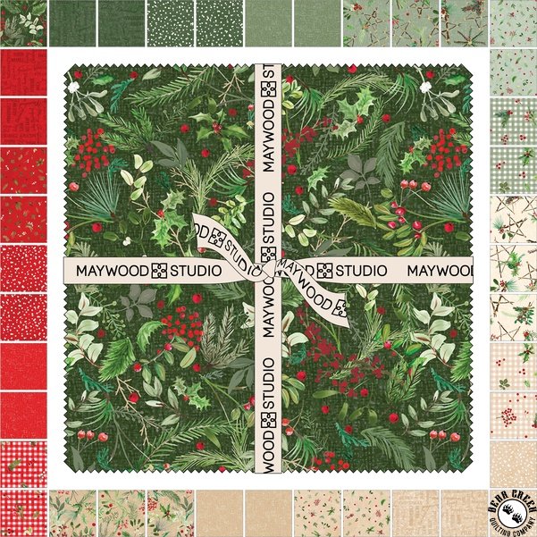 Bring the beauty of nature indoors this holiday season with Winter Wreaths  from Maywood Studio.  Brimming with twigs, sprigs, and berries, this collection offers everything you need for festive projects, printed on soft natural creams, rustic reds, and muted greens.  The running yardage features blocks of unique wreath designs — perfect as quilt cornerstones, block centers, or charming focal points in your seasonal creations.