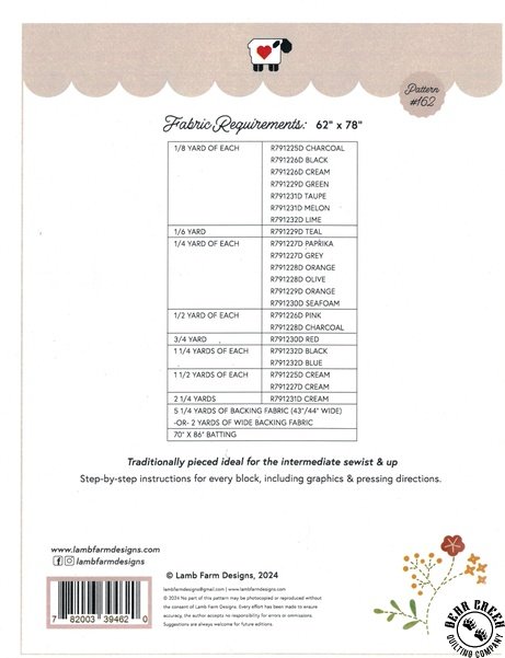 Woolly Whims Quilt Pattern View Larger Image Price: SALE $7.50 2 item(s) available. Item # PTN-162 | Reg. $29.99 Pin It Woolly Whims Quilt PatternFeaturing the Woolly Whims fabric collection by Marcus Fabrics. Pattern and instructions; fabric not included Finished quilt measures 62 inches by 78 inches Designed by Jennie Jo Lamb and Alex Imrie Produced by Lamb Farm Designs Copyright 2025