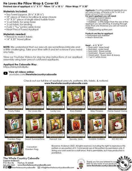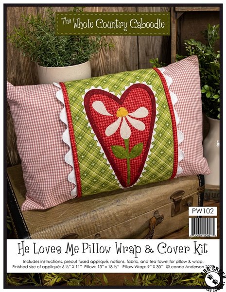 Wrapped in Love Pillow Wrap and Cover Kit - HE LOVES MEWrapped in Love Pillow Wrap and Cover Kit includes instructions that will guide you through the process of creating a fun pillow cover, and an adorable pillow wrap. The tea towel fabric used for the cover comes in a complimentary fabric that makes a great back drop for your pillow wrap. The applique pieces are all pre-cut and pre-fused for ease of use for most any skill level.