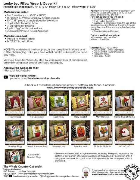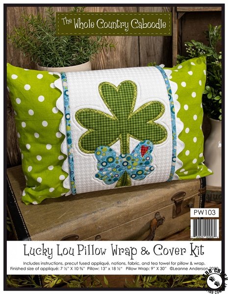Wrapped in Love Pillow Wrap and Cover Kit - LUCKY LOUWrapped in Love Pillow Wrap and Cover Kit includes instructions that will guide you through the process of creating a fun pillow cover, and an adorable pillow wrap. The tea towel fabric used for the cover comes in a complimentary fabric that makes a great back drop for your pillow wrap. The applique pieces are all pre-cut and pre-fused for ease of use for most any skill level.