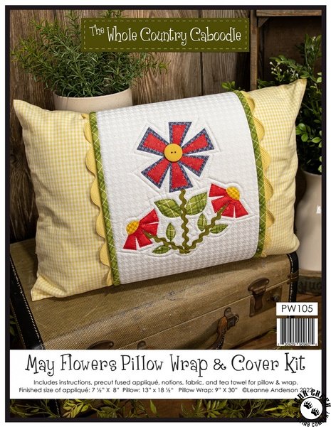 Wrapped in Love Pillow Wrap and Cover Kit - MAY FLOWERSWrapped in Love Pillow Wrap and Cover Kit includes instructions that will guide you through the process of creating a fun pillow cover, and an adorable pillow wrap. The tea towel fabric used for the cover comes in a complimentary fabric that makes a great back drop for your pillow wrap. The applique pieces are all pre-cut and pre-fused for ease of use for most any skill level.