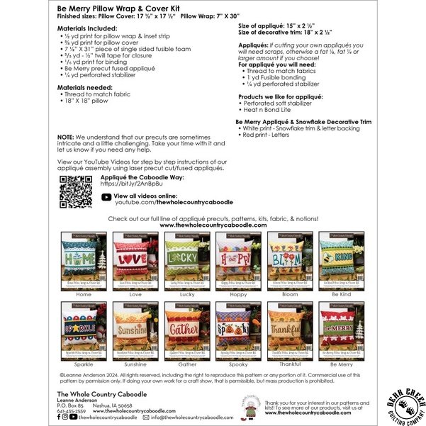 Wrapped with Words Pillow Wrap Kit includes instructions that will guide you through the process of creating a fun pillow cover, and an adorable pillow wrap. The applique pieces are all pre-cut and pre-fused for eas of use for most any skill level.