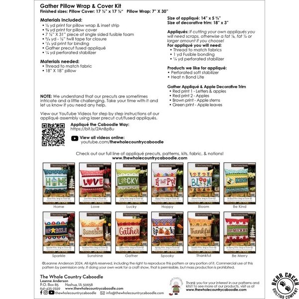 Wrapped with Words Pillow Wrap Kit includes instructions that will guide you through the process of creating a fun pillow cover, and an adorable pillow wrap. The applique pieces are all pre-cut and pre-fused for eas of use for most any skill level.