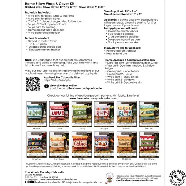 includes instructions that will guide you through the process of creating a fun pillow cover, and an adorable pillow wrap. The applique pieces are all pre-cut and pre-fused for eas of use for most any skill level.
